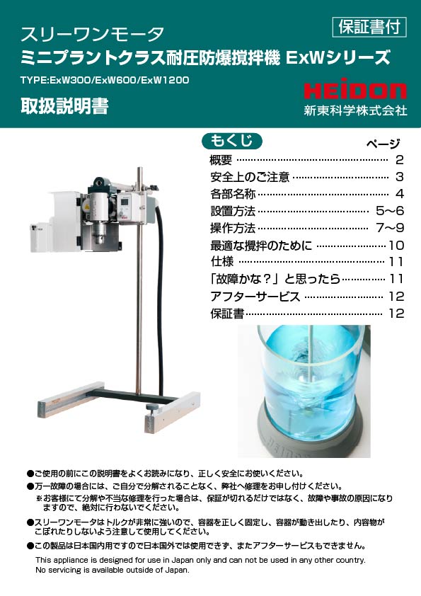 ミニプラントクラス耐圧防爆撹拌機 ExWシリーズ 取扱説明書です。